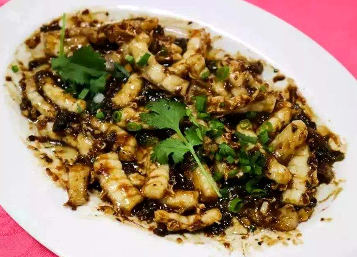 如果面豉蒸五花肉在現(xiàn)今的人們看來不夠健康,那么另一道家常菜面豉蒸魚腩,就是不少家里健康又鮮味的代表。南番順地區(qū),四大家魚是最常見的魚類,尤其是大頭魚和鯇魚是很多家庭餐桌上的“常客”。這些塘魚由于長期生活在淡水魚塘中,魚肉水分大,腥味較重,所以在制作的時(shí)候,如何去腥提鮮是對(duì)制作人最大的挑戰(zhàn)。除了常見的姜、蒜、陳皮之外,廚師們還會(huì)加入醬料,面豉就是其中一款常用的醬料。一尾新鮮的魚腩,洗凈之后先用鹽抹勻,面豉醬中加入姜、蒜、蔥、陳皮、糖等調(diào)味之后,再均勻放在魚腩上面,加入鍋中大火蒸熟,上桌前撒入蔥絲,淋入燒熱的花生油,簡單快捷。這道菜講究的是搭配和食材新鮮,上桌的時(shí)候已經(jīng)是鮮香撲鼻,讓人食指大動(dòng)。面豉的豆香很好地去除了魚肉的泥腥,咸香的豉汁提升了魚肉的鮮甜,加上生油、蔥蒜的加持,令人在吃這塊魚腩的時(shí)候,能感受到魚腩的細(xì)滑,魚油的香,魚肉的鮮,不同部位的特色都得到了最佳的體現(xiàn)。蒸魚的魚汁更是咸香鮮甜,是拌飯的最佳拍檔,這道菜無論是賣相還是味道都是經(jīng)典的咸鮮,無論用來待客還是犒賞家人都不會(huì)“失禮人”。