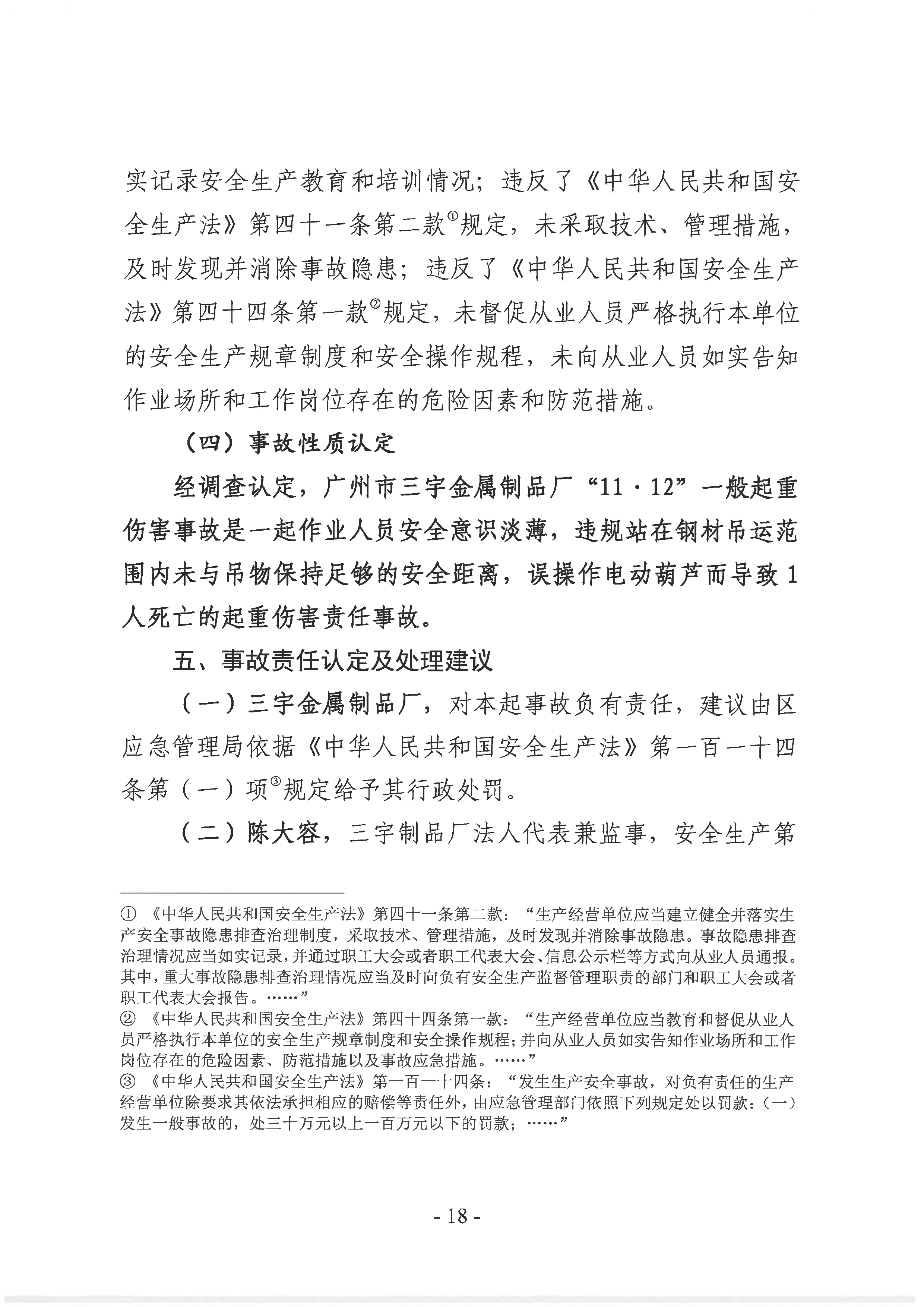 廣州市三宇金屬制品廠“11·12”一般起重傷害事故調查報告