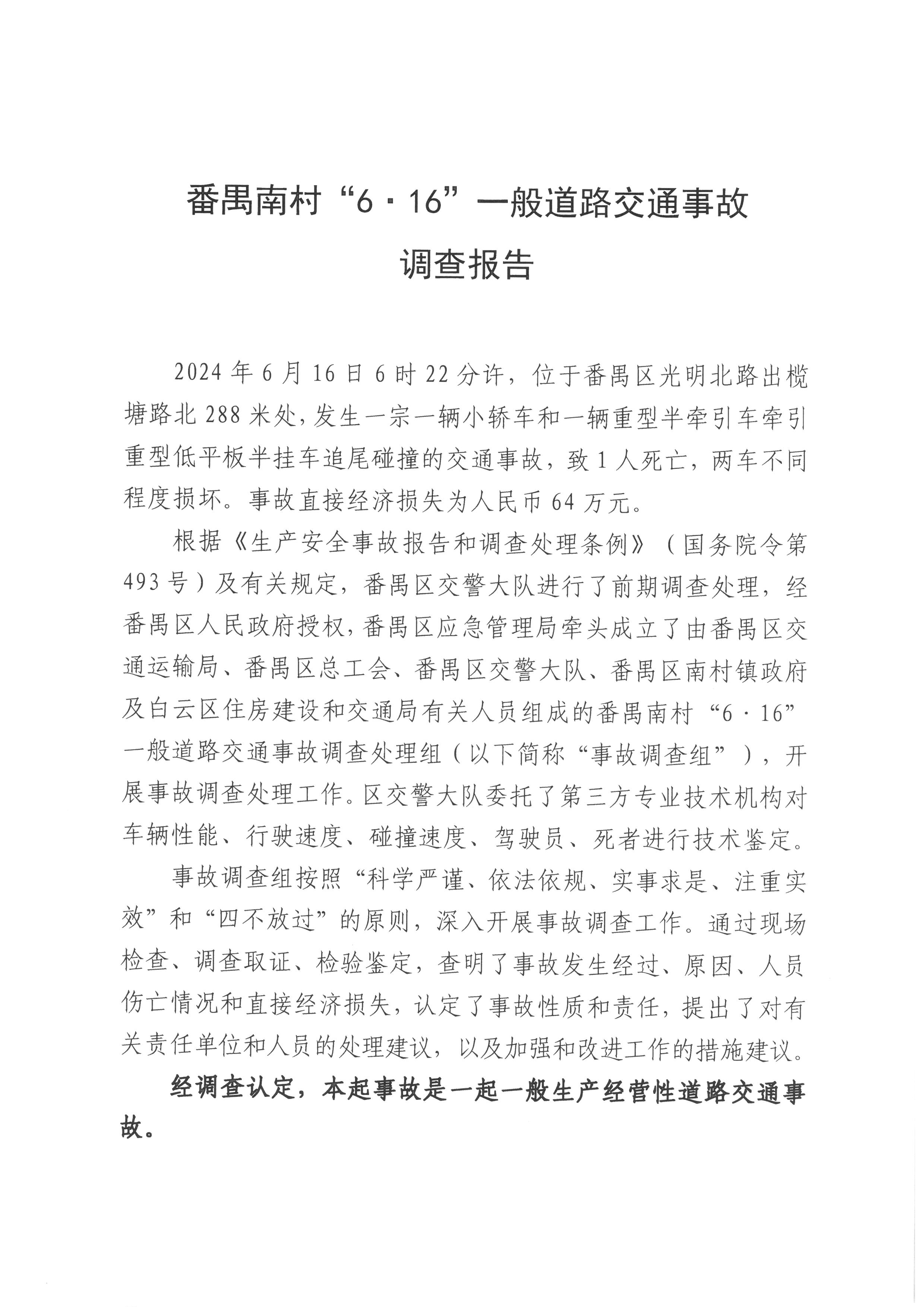 番禺南村“6·16”一般道路交通事故調查報告