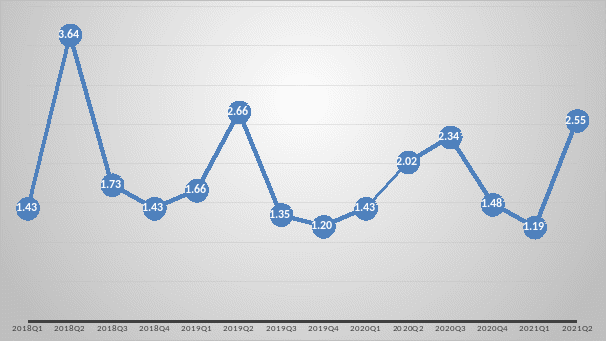 2021年第二季度,用工需求人數(shù)與求職人數(shù)的比率(求人倍率)為2.55,同比上升0.53,即從去年同期平均2.02個崗位對應(yīng)1名求職者,上升到本季度平均2.55個崗位對應(yīng)1名求職者。