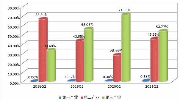 2021年第二季度,第一產(chǎn)業(yè)用工需求比例為0.68%,同比上升0.38%;第二產(chǎn)業(yè)用工需求比例為45.55%,同比上升17.40%;第三產(chǎn)業(yè)用工需求比例為53.77%,同比下降17.78%。