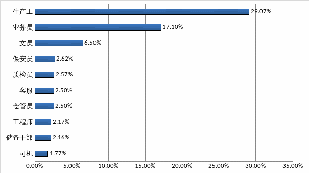 2021年第二季度,用人單位需求較大排名前三位的工種為生產(chǎn)工、業(yè)務(wù)員、文員,分別占工種總需求的29.07%、17.10%、6.50%,其中生產(chǎn)工的需求同比上升10.07%,業(yè)務(wù)員的需求同比下降5.20%,文員的需求同比上升1.37%。