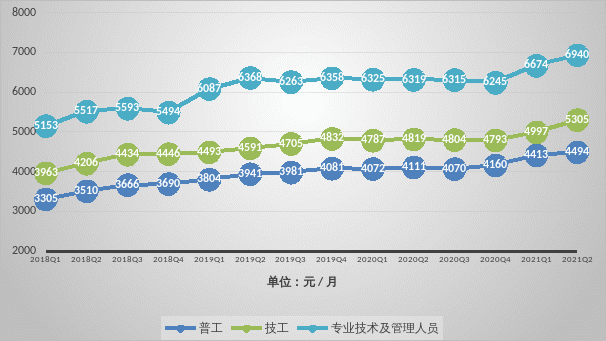 2021年第二季度末,企業(yè)在崗員工中,普工的平均工資為4494元/月,同比上升9.32%;技工的平均工資為5305元/月,同比上升10.09%;專業(yè)技術(shù)及管理人員的平均工資為6940元/月,同比上升9.83%。