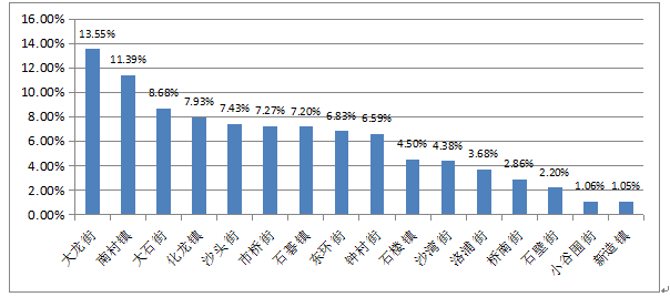 2021年第三季度,我區外來務工人員按就業地劃分,人數排名前三的鎮(街)是大龍街、南村鎮、大石街,占我區外來務工人員總數的比例分別為13.55%、11.39%、8.68%。總體排名跟上季度相比沒有明顯變化。