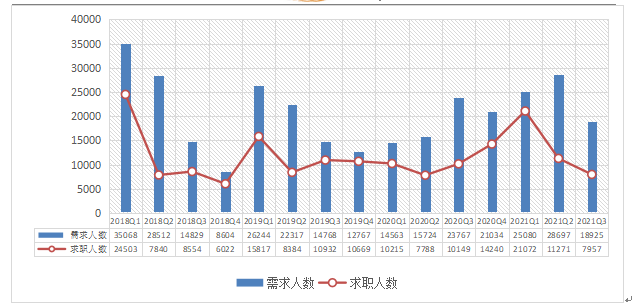 2021年第三季度,用人單位登記招聘各類人員18925人次,同比減少20.37%。求職人數為7957人次,同比減少21.60%。