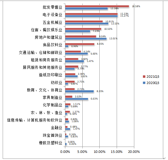 2021年第三季度,批發零售業、電子設備業、五金機械業占用工需求的前三位。從圖1-4中可以看出,用工需求同比變化較大的行業有:食品飲料業,同比上升7.49%;批發零售業,同比上升6.20%;教育、文化、體育業,同比下降5.62%;家具制造業,同比下降4.61%。