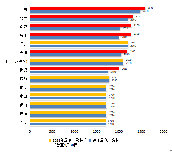 2021年第三季度,十四個重點城市的企業最低工資標準,上海市為2590元/月,同比提高了4.44%;北京市為2320元/月,同比提高了5.45%;南京市為2280元/月,同比提高12.87%;杭州市為2280元/月,同比提高13.43%;天津市為2180元/月,同比提高了6.34%;武漢市為2010元/月,同比提高14.86%。其他地區不變。番禺區企業最低工資標準為2100元/月,非全日制職工小時最低工資標準為20.3元/小時。我區最低工資標準近三年未有變化。