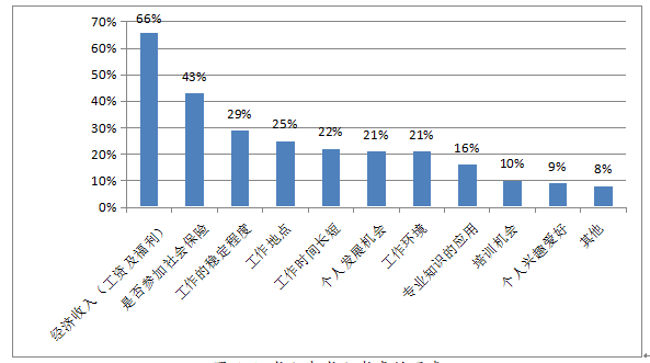 2021年第三季度,求職者求職主要考慮以下因素:經濟收入(工資及福利),有66%求職者選擇,環比下降1%;是否參加社會保險,有43%求職者選擇,環比上升9%;工作的穩定程度,有29%求職者選擇,環比上升12%。