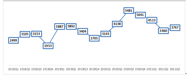 2021年第三季度,企業在崗員工中,2019屆至2021屆的高校畢業生有10253人,占在崗總人數5.47%,環比上升了0.17%;其中,2019屆的占比2.04%,2020屆的占比2.04%,2021屆的占比1.56%。