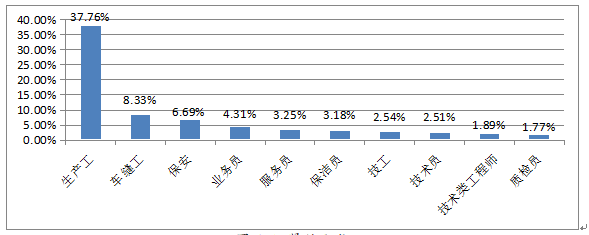 2021年第三季度,用人單位需求較大排名前三位的工種為生產工、業務員、文員,分別占工種總需求的35.00%、13.60%、4.34%,其中生產工的需求同比上升2.33%,業務員的需求同比下降3.77%,文員的需求同比下降0.77%。