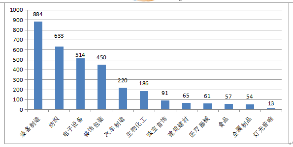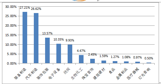 企業劃分為12個行業,行業企業數量排名前三是:裝備制造業、電子設備業、裝飾包裝業,分別占企業總數的34%、18%、10%。