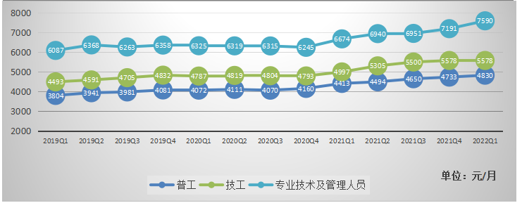 2022年第一季度末,企業在崗員工中,普工的平均工資為4830元/月,同比上升9.45%;技工的平均工資為5578元/月,同比上升11.63%;專業技術及管理人員的平均工資為7590元/月,同比上升13.72%。