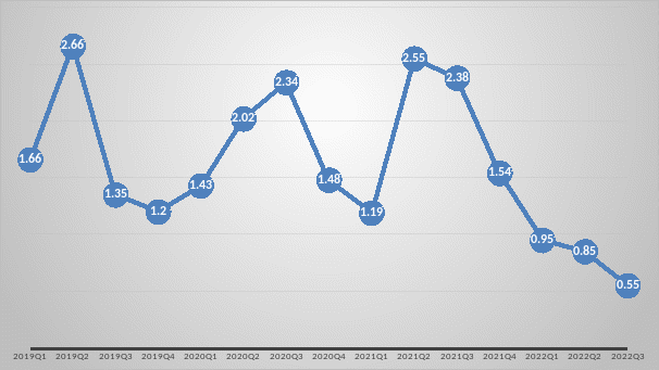 2022年第三季度,用工需求人數與求職人數的比率(求人倍率)為0.55,同比下降1.83,即從去年平均2.38個崗位對應1名求職者,下降到今年平均0.55個崗位對應1名求職者。