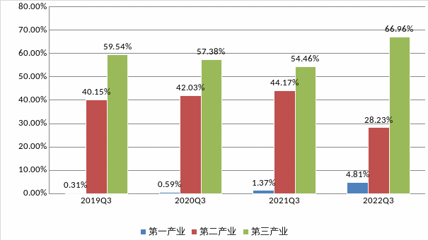 2022年第三季度,第一產業用工需求比例為4.81%,同比上升3.44%;第二產業用工需求比例為28.23%,同比下降15.94%;第三產業用工需求比例為66.96%,同比上升12.50%。