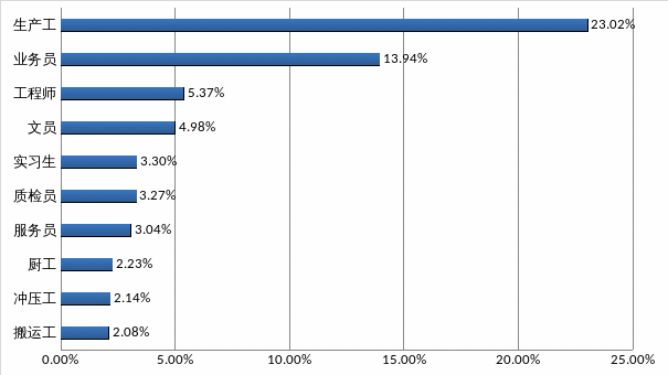 2022年第三季度,用人單位需求較大排名前三位的工種為生產工、業務員、工程師,分別占工種總需求的23.02%、13.94%、5.37%,其中生產工的需求同比下降11.98%,業務員的需求同比上升0.34%,工程師的需求同比上升3.59%。