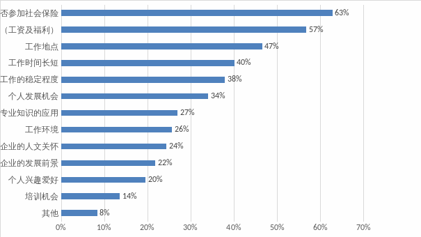 2022年第三季度,求職者求職主要考慮以下因素:是否參加社會保險,有63%求職者選擇;經濟收入(工資及福利),有57%求職者選擇;工作地點,有47%求職者選擇。