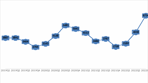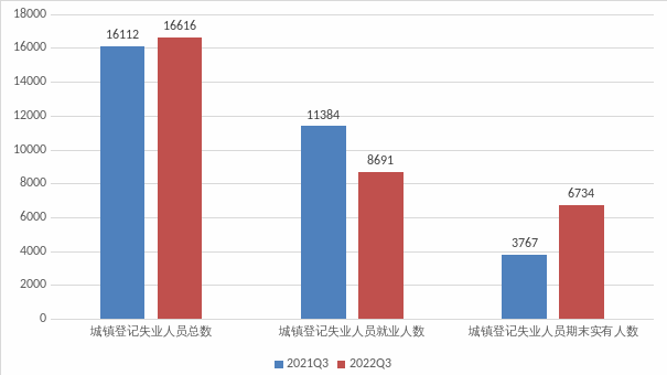 2022年第三季度末,城鎮登記失業人員期末實有人數6734人,同比增加78.76%。