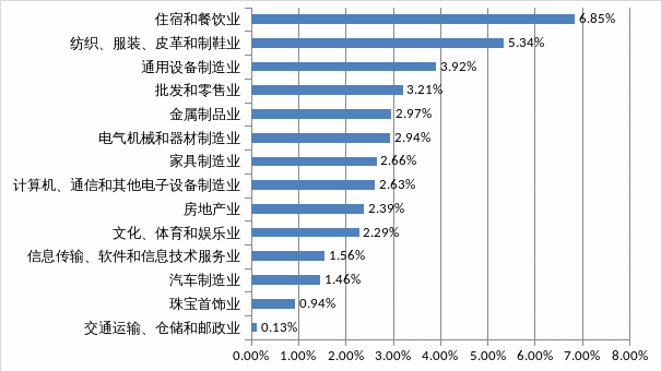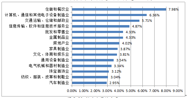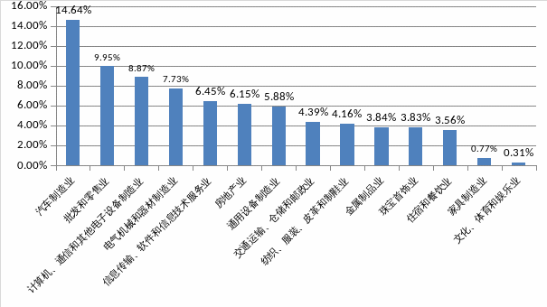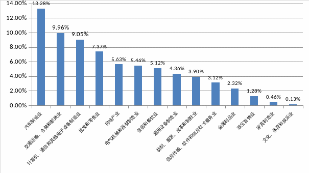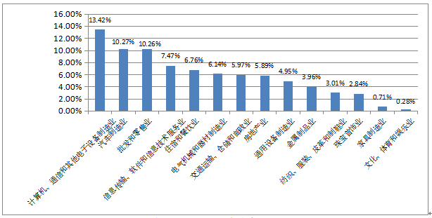 14個行業中,每個行業流失人數占流失總人數比例排名前三是計算機、通信和其他電子設備制造業,汽車制造業,批發和零售業,分別占比13.42%、10.27%、10.26%;占比最低是文化、體育和娛樂業,為0.28%。