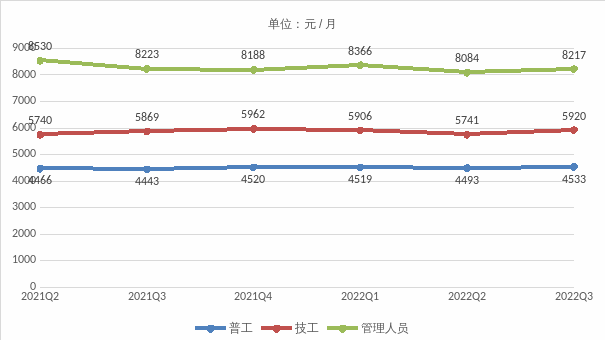 2022年第三季度,企業在崗員工中,普工月平均工資4533元,同比上升2.03%;技工月平均工資5920元,同比上升0.87%;管理人員月平均工資8217元,同比下降0.07%。
