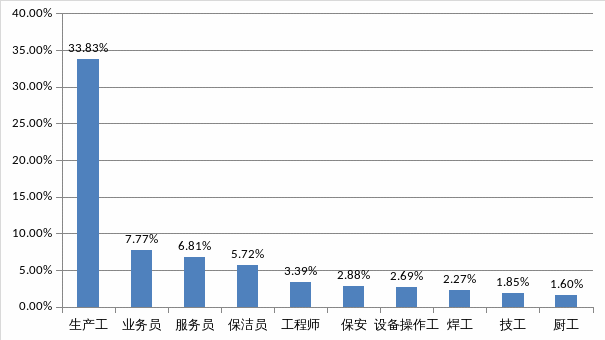 企業緊缺職位總人數有3127人,其中排名前三是生產工、業務員、服務員,分別占比33.83%、7.77%、6.81%。