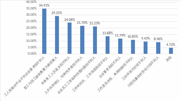 有“招工難”現象的企業中認為存在“招工難”問題的主要原因排名前三是“工人技能水平達不到企業要求招不到人”,有34.91%企業選擇;“普工與技工缺崗數量大難招夠人”,有29.25%企業選擇;“外來務工人員返鄉招不到人”,有24.06%企業選擇。