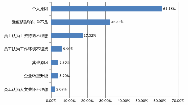 企業人員流失原因排名前三是個人原因,有61.18%企業選擇;受疫情影響訂單不足,有32.35%企業選擇;員工認為工資待遇不理想,有17.32%企業選擇。