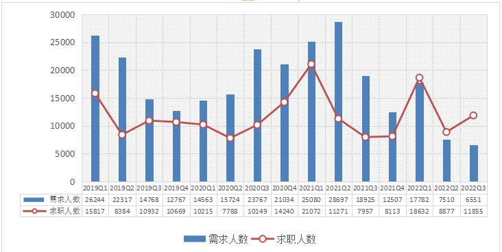 2022年第三季度,用人單位登記招聘各類人員6551人次,同比減少65.38%。求職人數為11855人次,同比增加48.99%。