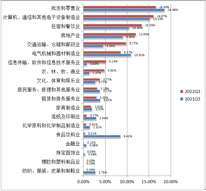 2022年第三季度,14個行業中用工量占比排名前三是汽車制造業,批發和零售業,計算機、通信和其他電子設備制造業,分別占用工總量14.64%、9.95%、8.87%。用工量最少的是文化、體育和娛樂業,占用工總量0.31%。用工量變化大的行業有:批發和零售業,同比下降5.49%;汽車制造業,同比增長6.17%;其他行業用工量變化較小。