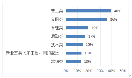 2022年第三季度,求職者期望從事工種類別排名前三的是:普工類,有40%求職者選擇;文職類,有36%求職者選擇;管理類,有19%求職者選擇。
