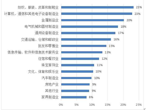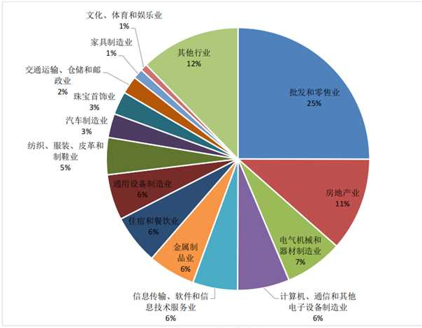 2022年第三季度,我區1051家就業失業情況動態監測企業主要分為14個行業,分別是批發和零售業,房地產業,電氣機械和器材制造業,計算機、通信和其他電子設備制造業,信息傳輸、軟件和信息技術服務業,金屬制品業,住宿和餐飲業,通用設備制造業,紡織、服裝、皮革和制鞋業,汽車制造業,珠寶首飾業,交通運輸、倉儲和郵政業,家具制造業,文化、體育和娛樂業。其中,企業數量最多的是“批發和零售業”,占比25%;企業數量最少的是“家具制造業”和“文化、體育和娛樂業”,占比都只有1%。