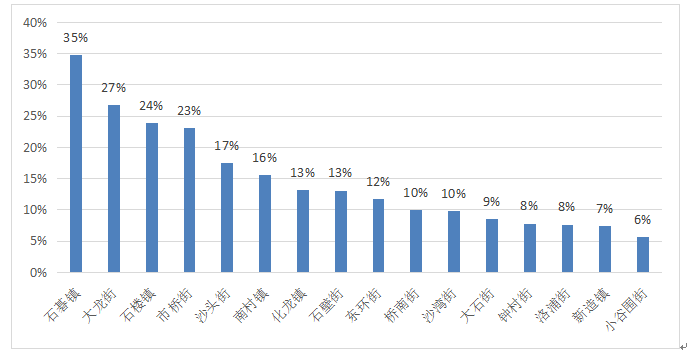 2022年第三季度末,我區外來務工人員按就業地劃分,人數排名前三的鎮(街)是大龍街、南村鎮、大石街,占我區外來務工人員總數的比例分別為13.44%、11.53%、8.76%。總體排名跟去年同期相比沒有變化。