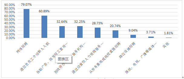 企業招聘新員工方式排名前三是網絡招聘,有79.07%企業采用;通過老員工介紹新人入職,有60.89%企業采用;張貼廣告、派發招工宣傳單張,有32.64%企業采用。