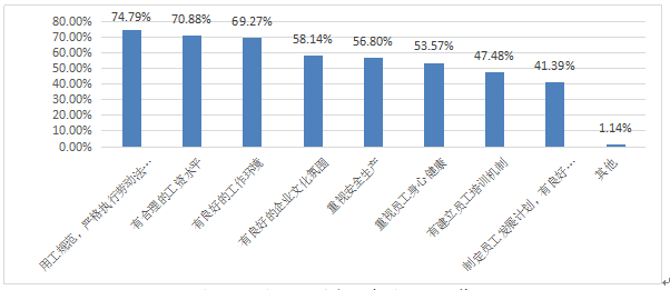 企業吸引求職者的主要優勢排名前三是“用工規范,嚴格執行勞動法律法規和用工管理的相關規定”,有74.79%企業選擇;“有合理的工資水平”,有70.88%企業選擇;“有良好的工作環境”,有69.27%企業選擇。