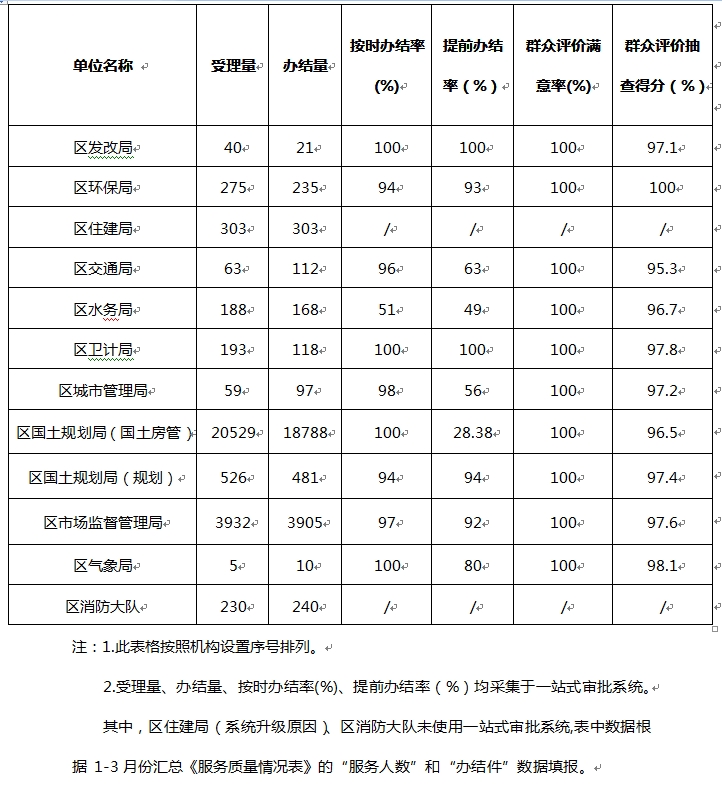 其中,區民政局、區國稅局、區地稅局未使用一站式審批系統,表中數據根據 1-3月份匯總《服務質量情況表》的“服務人數”和“辦結件”數據填報。