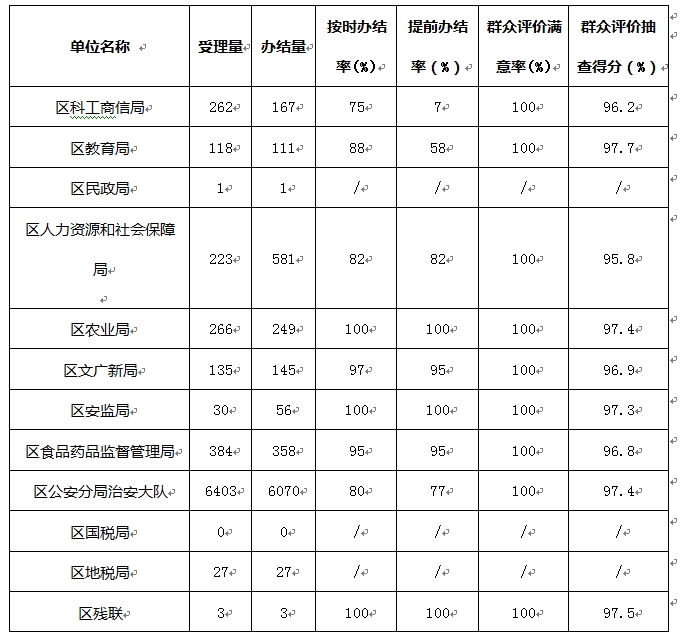 序號 | 職能部門 | 辦件總數量 | 按時辦結件數 | 按時辦結率 | 提前辦結時間 | 提前辦結率 |