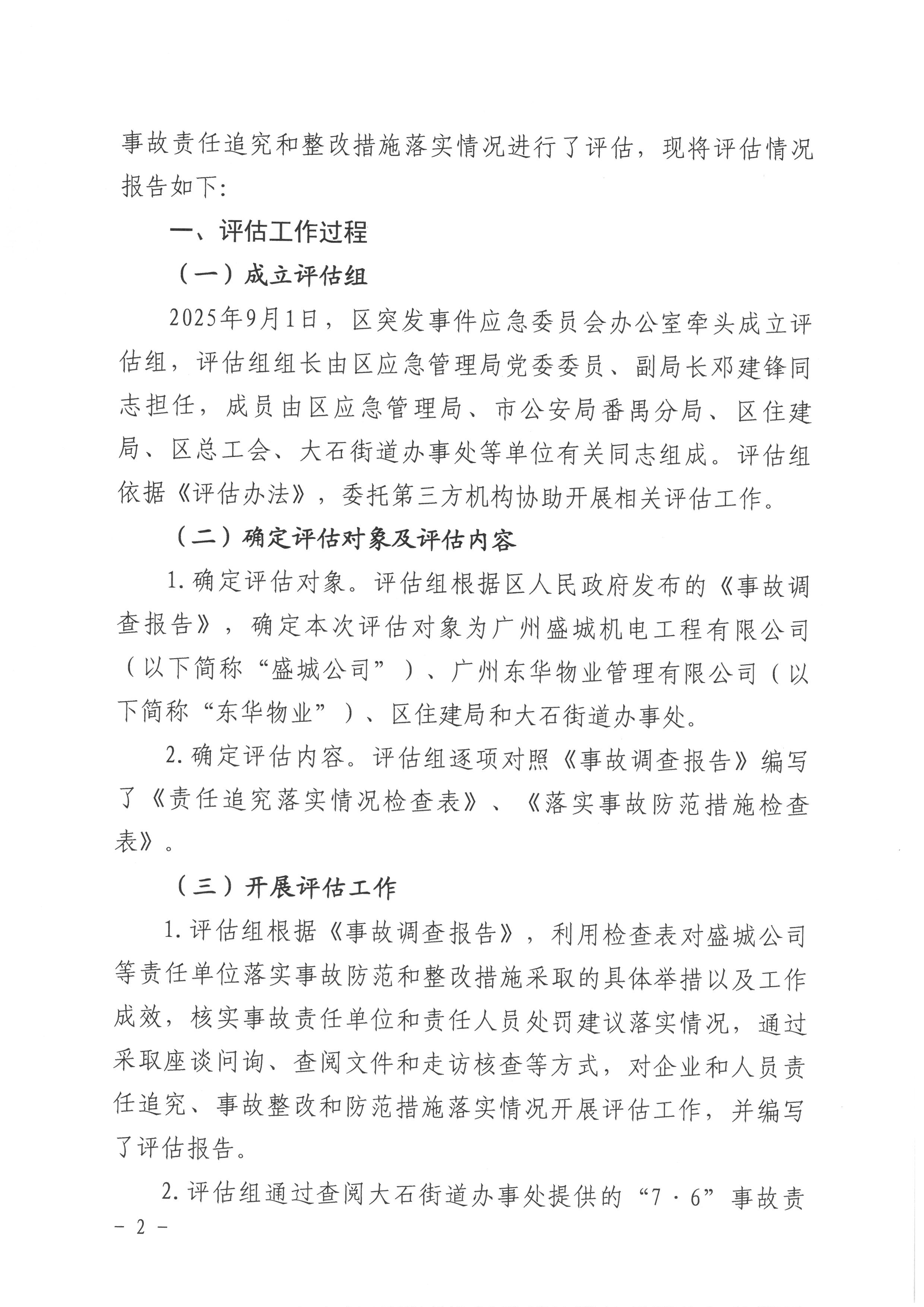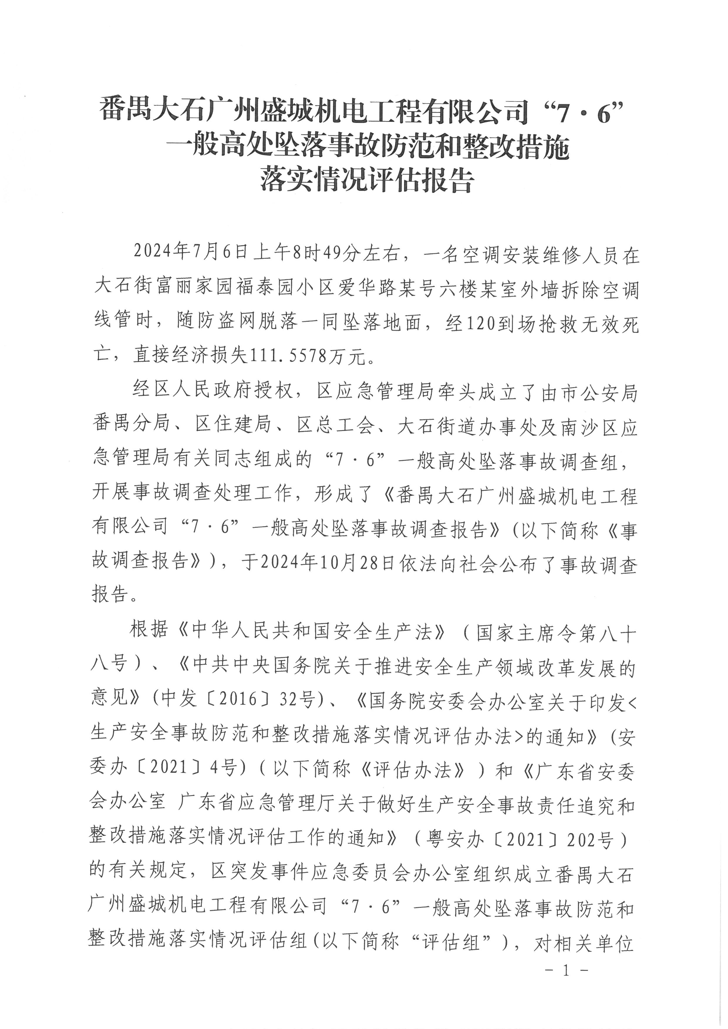 番禺大石廣州盛城機(jī)電工程有限公司“7·6”一般高處墜落事故防范和整改措施落實情況評估報告