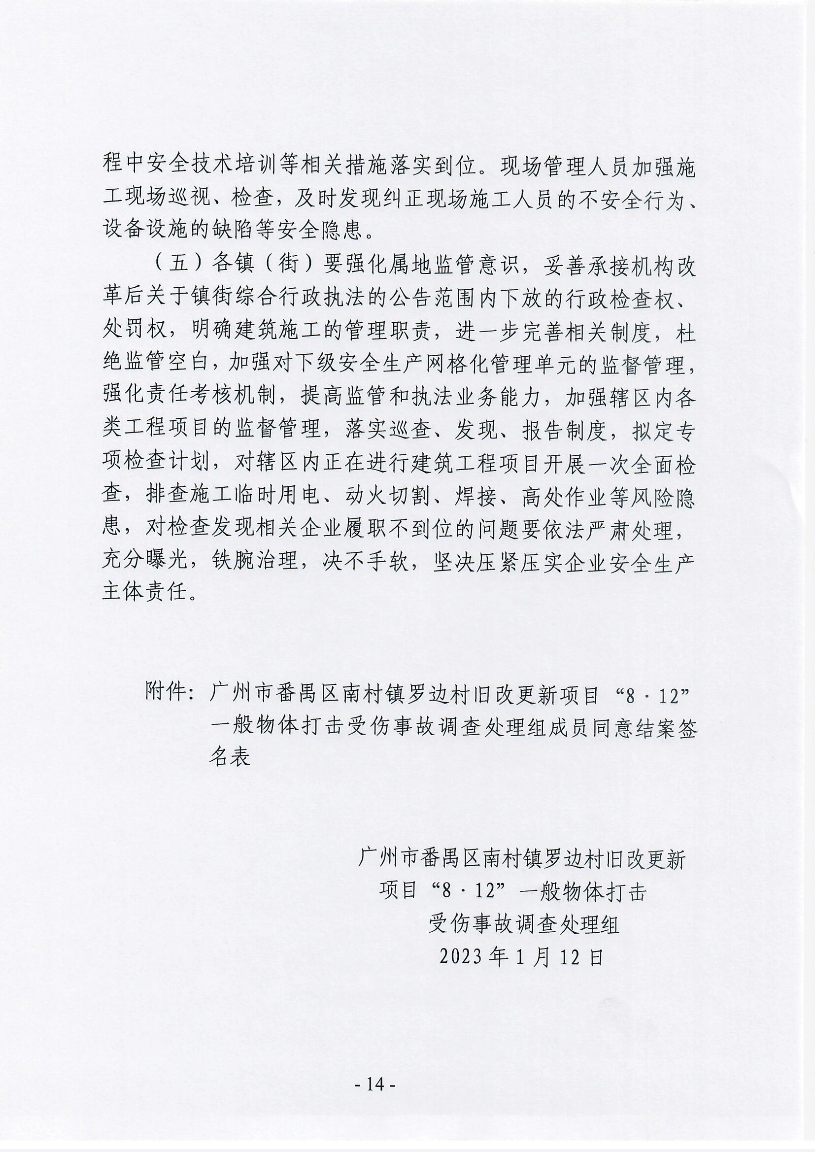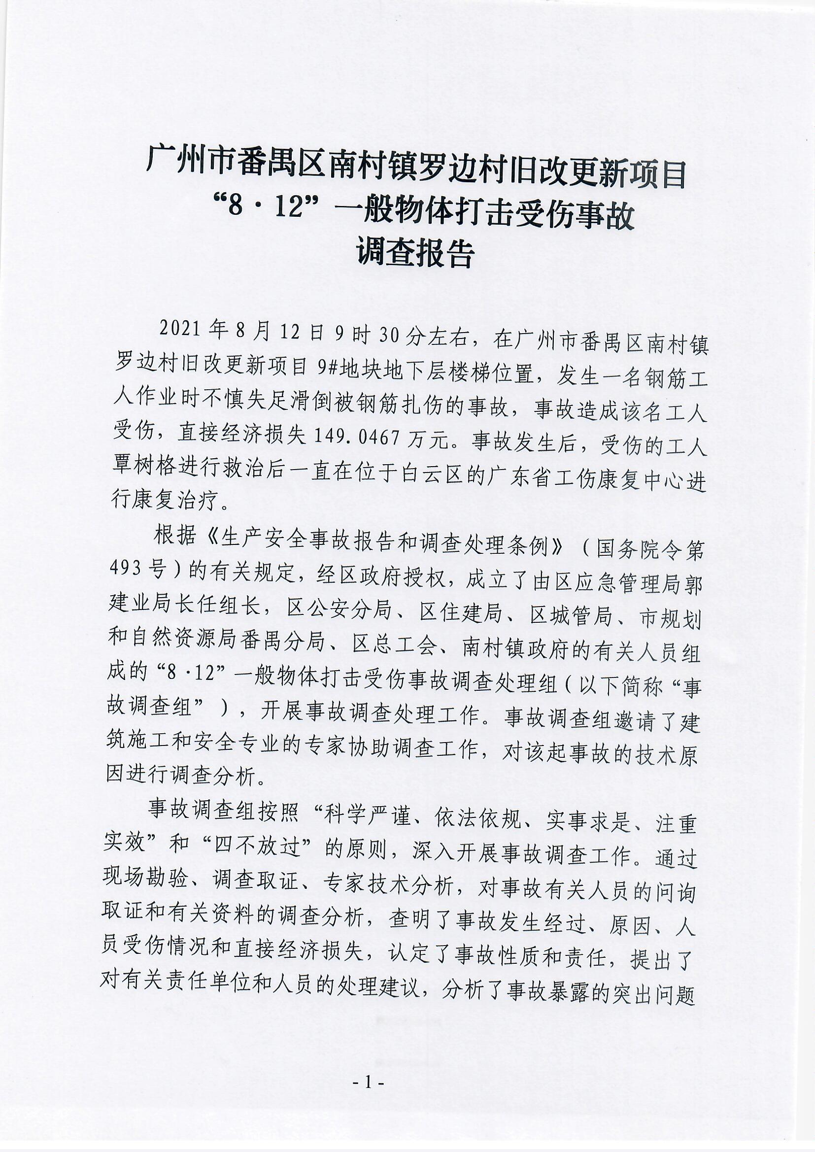 廣州市番禺區南村鎮羅邊村舊改更新項目“8·12”一般物體打擊受傷事故調查報告