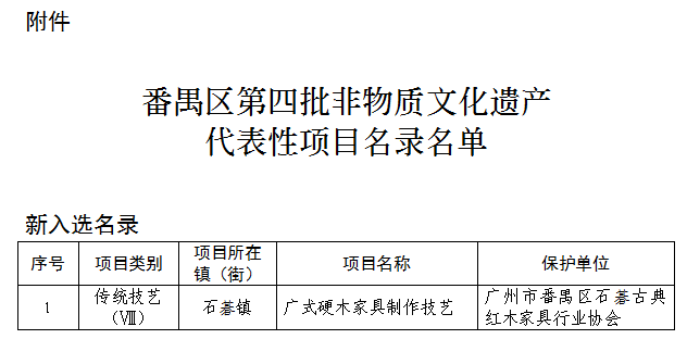 根據(jù)《中華人民共和國非物質文化遺產(chǎn)法》《國務院辦公廳關于加強我國非物質文化遺產(chǎn)保護工作的意見》和《廣東省非物質文化遺產(chǎn)條例》等有關規(guī)定,經(jīng)區(qū)級專家評審和區(qū)非物質文化遺產(chǎn)保護中心評定并向社會公示,同意將“廣式硬木家具制作技藝”項目列入我區(qū)第四批非物質文化遺產(chǎn)代表性項目名錄,現(xiàn)予以公布。