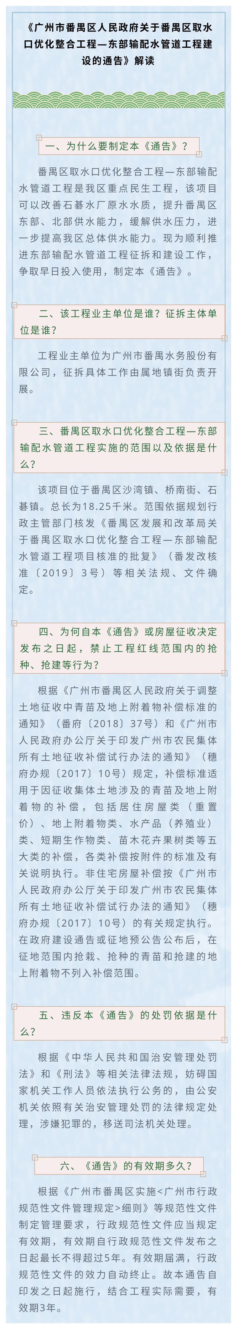 點擊查看相關政策文件:廣州市番禺區(qū)人民政府關于番禺區(qū)取水口優(yōu)化整合工程—東部輸配水管道工程建設的通告