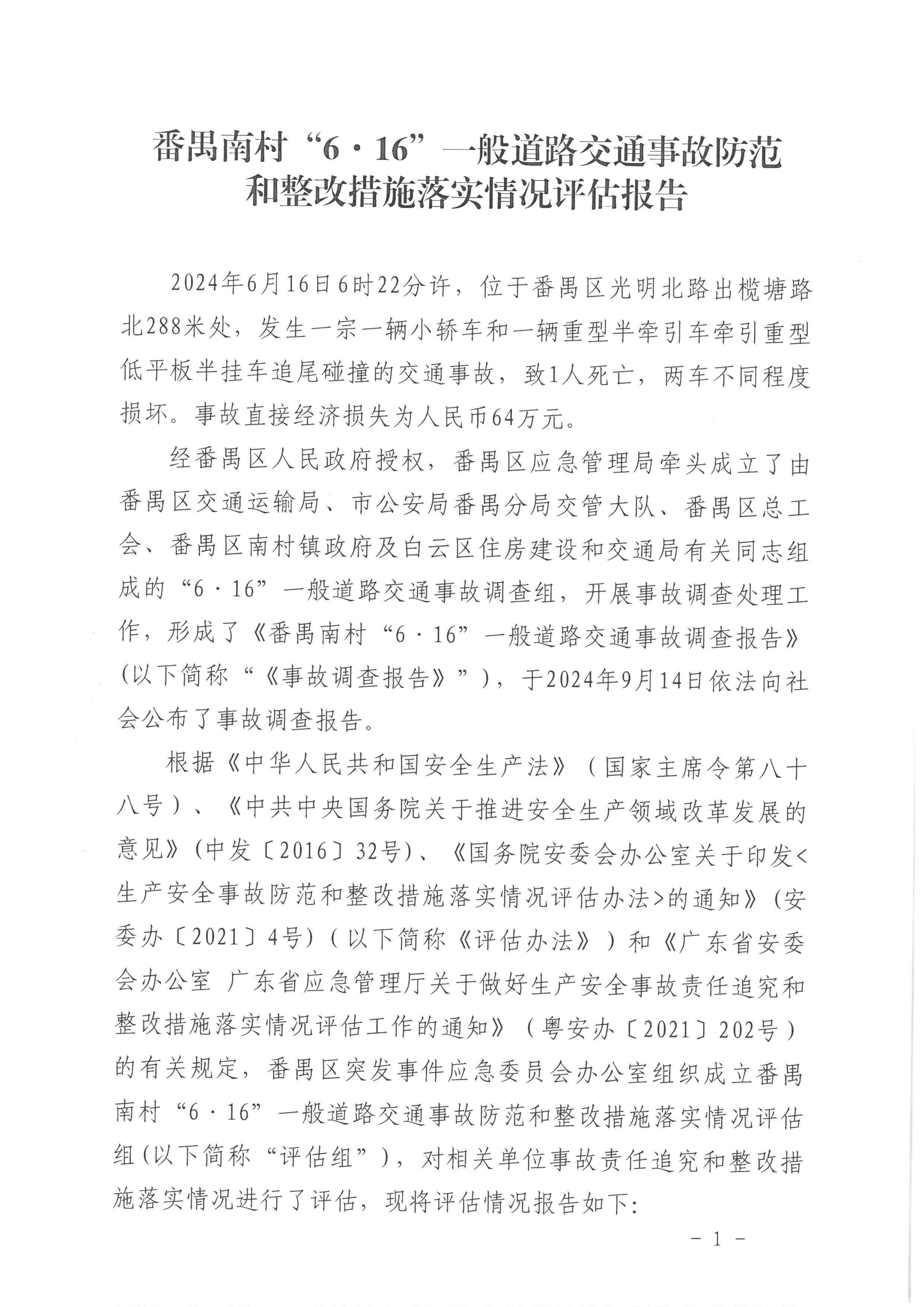 番禺南村“6·16”一般道路交通事故防范和整改措施落實情況評估報告
