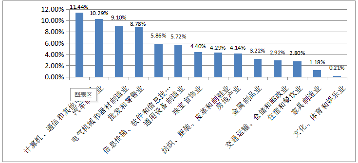 2021年第二季度,14個行業中用工量占比排名前三的是批發和零售業,計算機、通信和其他電子設備制造業,汽車制造業,分別占用工總量的11.95%、9.92%、9.15%。用工量最少的是文化、體育和娛樂業,占用工總量的0.31%。