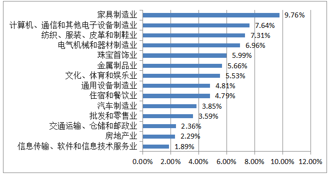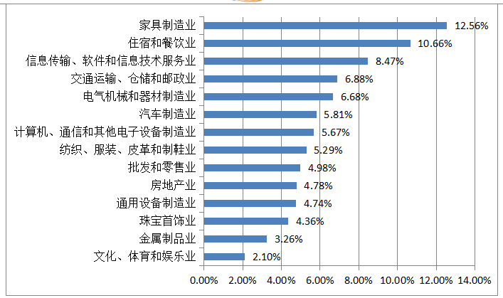 企業在第二季度內已招聘總人數為6519人,實際缺工總人數為7979人。實際缺工總人數與在崗總人數之比(缺工率)為4.72%。14個行業中,缺工率排名前三的是家具制造業,計算機、通信和其他電子設備制造業,紡織、服裝、皮革和制鞋業,分別為9.76%、7.64%、7.31%。缺工率最低的信息傳輸、軟件和信息技術服務業,只有1.89%。