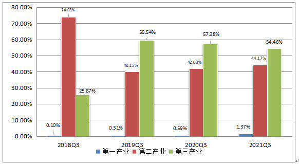 2021年第三季度,第一產業用工需求比例為1.37%,同比上升0.78%;第二產業用工需求比例為44.17%,同比上升2.14%;第三產業用工需求比例為54.46%,同比下降2.92%。