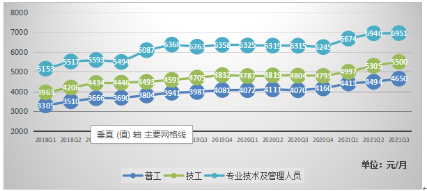 2021年第三季度末,企業在崗員工中,普工的平均工資為4650元/月,同比上升14.25%;技工的平均工資為5500元/月,同比上升14.49%;專業技術及管理人員的平均工資為6951元/月,同比上升10.07%。