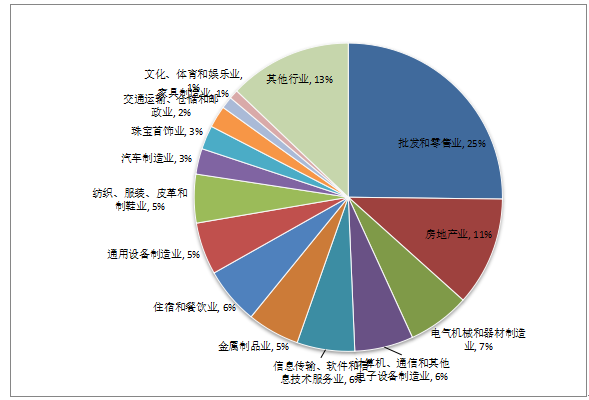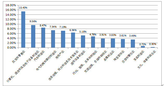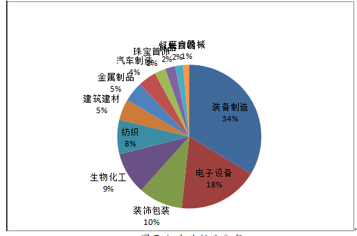 企業劃分為12個行業,行業企業數量排名前三是:裝備制造業、電子設備業、裝飾包裝業,分別占企業總數的34%、18%、10%。