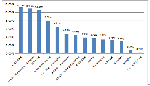 14個行業中,每個行業計劃招聘人數占計劃招聘總人數比例排名前三的是批發和零售業,計算機、通信和其他電子設備制造業,汽車制造業,分別占比11.29%、10.99%、10.68%;占比最低的是文化、體育和娛樂業,占0.21%。