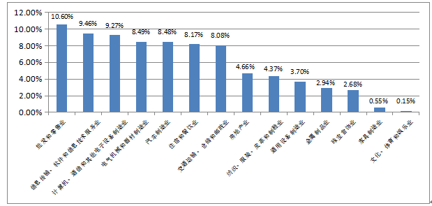 14個行業中,每個行業流失人數占流失總人數比例排名前三的是:批發和零售業,信息傳輸、軟件和信息技術服務業,計算機、通信和其他電子設備制造業,分別占比10.60%、9.46%、9.27%;占比最低的是文化、體育和娛樂業,占0.15%。