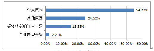 企業人員流失原因選“個人原因”的有54.33%,選“其他原因”的有24.52%,選“受疫情影響訂單不足”的有15.58%,選“企業轉型升級”的有2.21%。造成人員流失的主要是員工個人原因,受疫情影響造成人員流失的占比較小,由此可見企業經營總體情況較穩定。
