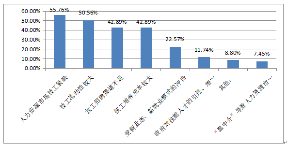 企業在招用技工過程中遇到的主要困難排名前四的是:“人力資源市場技工緊缺”,有55.76%企業選擇;“技工流動性較大”,有50.56%企業選擇;“技工招聘渠道不足”,有42.89%企業選擇;“技工培養成本較大”,有42.89%企業選擇。