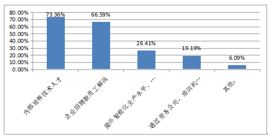 企業主要采取“內部培養技術人才”和“企業招聘新員工解決”方式解決技工短缺問題,分別有73.36%、66.59%企業選擇。綜上所述,企業解決技工短缺的方式有限。